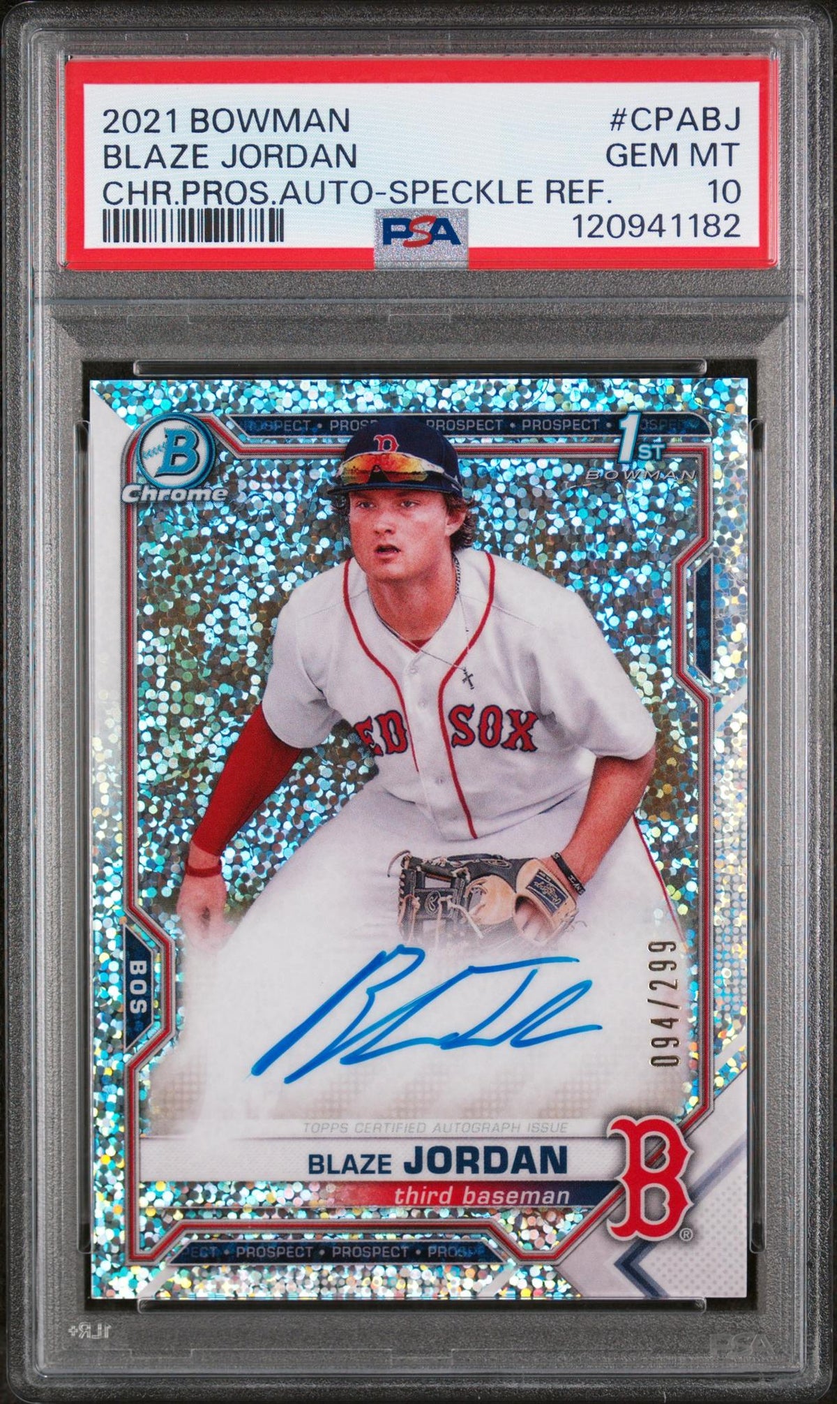 Step into the diamond with this absolute gem of a sports card! This is a stunning 2021 Bowman CHR.PRO.S.AUTO-SPECKLE REF. Blaze Jordan rookie card by Topps, the leaders in sports memorabilia. The card features the Boston Red Sox sensation, Blaze Jordan, who is making waves in the MLB.