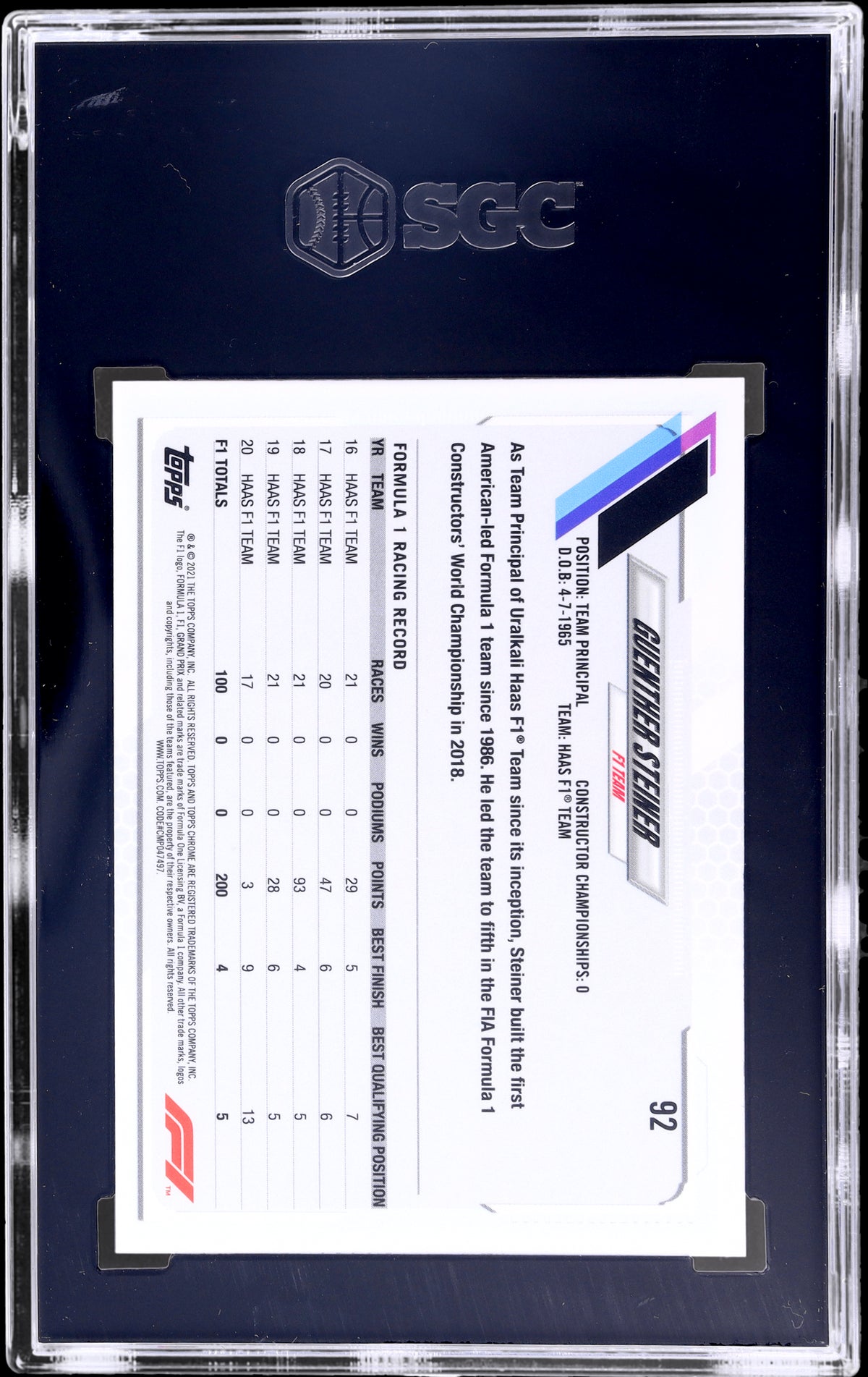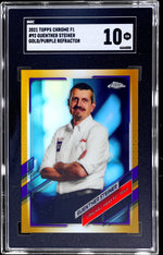 Experience the thrill of the race with the exceptional 2021 Topps Chrome F1 #92 Guenther Steiner Gold/Purple Ref. This card is an absolute gem, possessing an SGC 10 rating, which signifies its immaculate condition and undoubted authenticity. This card bears the image of the esteemed Guenther Steiner, a respected figure in the Formula 1 racing scene.