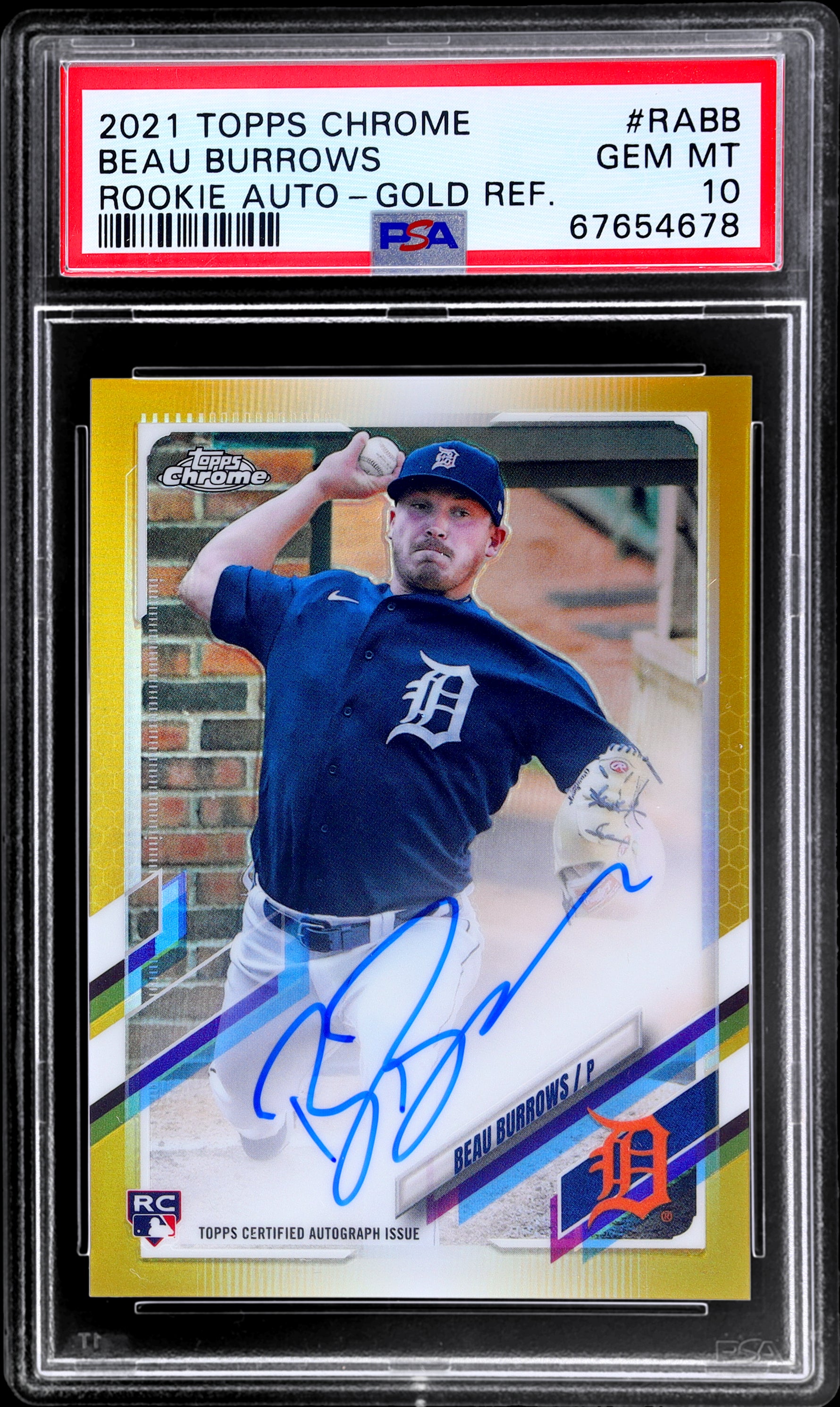 Feast your eyes on this gem - the 2021 Topps Chrome Rookie Autograph Gold Refractor Beau Burrows #RABB /50 PSA 10. A true treasure for any sports card enthusiast, this card is a standout piece from the acclaimed Topps Chrome series. This Rookie Autograph card features a captivating Gold Refractor finish, adding a level of sophistication and rarity to your collection.