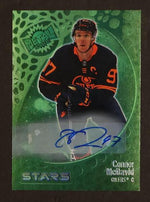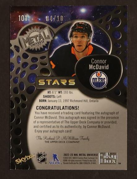 What sets this card apart is its autographed status, personally signed by McDavid himself. This signature adds a touch of authenticity and personal connection with one of the NHL's most remarkable players. But the exclusivity doesn't end here; this card is also serial numbered 10/10, making it a rare find in the world of sports cards.