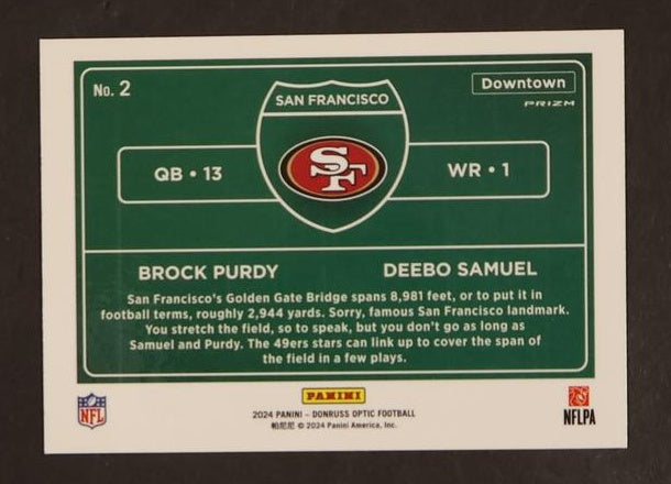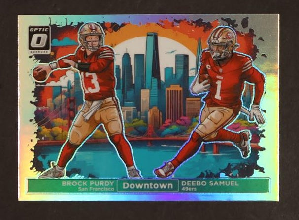 Uncover the magic of football like never before with this stunning 2022 Donruss Optic Downtown card! Featuring the dynamic duo of Brock Purdy and Deebo Samuel from the legendary San Francisco 49ers, this card exudes a charm that's hard to resist for any NFL enthusiast.
