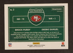 Brock Purdy and Deebo Samuel are the shining stars of the San Francisco 49ers, making this card a must-have for the fans of the team or those who appreciate the talent of these exceptional players. Whether you're a seasoned collector or just starting your journey, this card would be a spectacular addition to your collection.