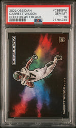 Presenting to you an absolute gem, a 2022 Panini Obsidian Color Blast Black rookie card featuring the promising NFL Jet's player, Garrett Wilson. This card is a stunning addition to any collection, showcasing a striking Color Blast Black parallel that sets it apart from the norm.