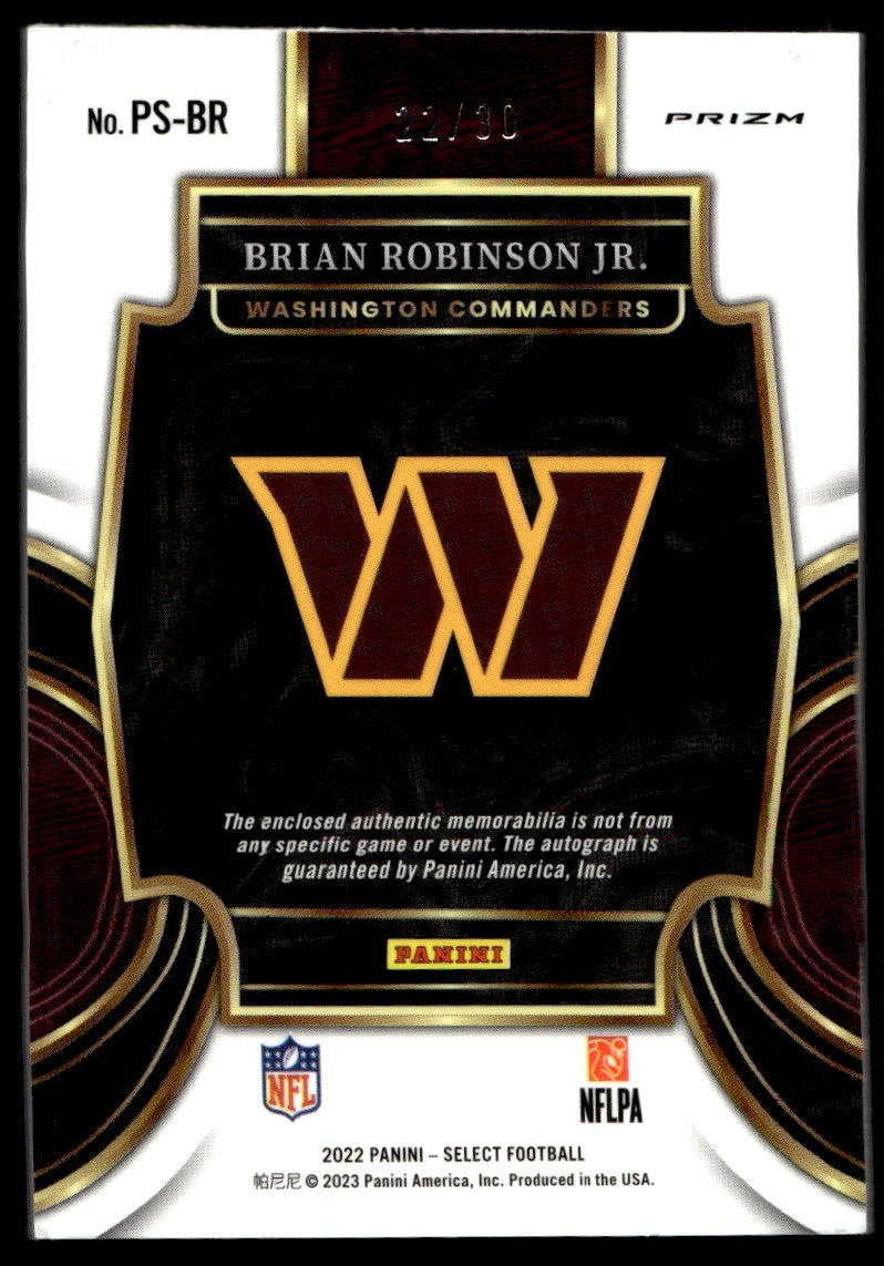 Gather around, NFL enthusiasts and sports card collectors! Feast your eyes on this dazzling 2022 Select PS-BR Brian Robinson Jr. Prizm card, a true diamond in the rough. Manufactured by the renowned Panini and belonging to the Select brand, this card is a magnificent addition to any collection.
