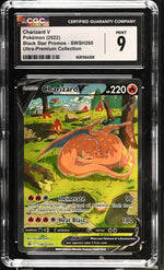 Take a moment to marvel at this incredible 2022 Black Star Promos SWSH260 Charizard V card, a stunning piece from Nintendo's Ultra-Premium Collection. Not just any card, this Charizard V is professionally graded by CGC with a high numeric grade of 9, verifying its mint condition.