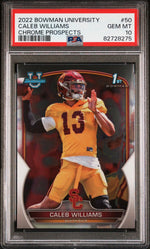 Enter the exciting world of sports trading with this exceptional 2022 Topps Bowman Chrome Prospects Card featuring the promising talent, Caleb Williams. A key player for USC and an emerging hero in the world of football, Williams' rookie card is a must-have addition for any serious collector.