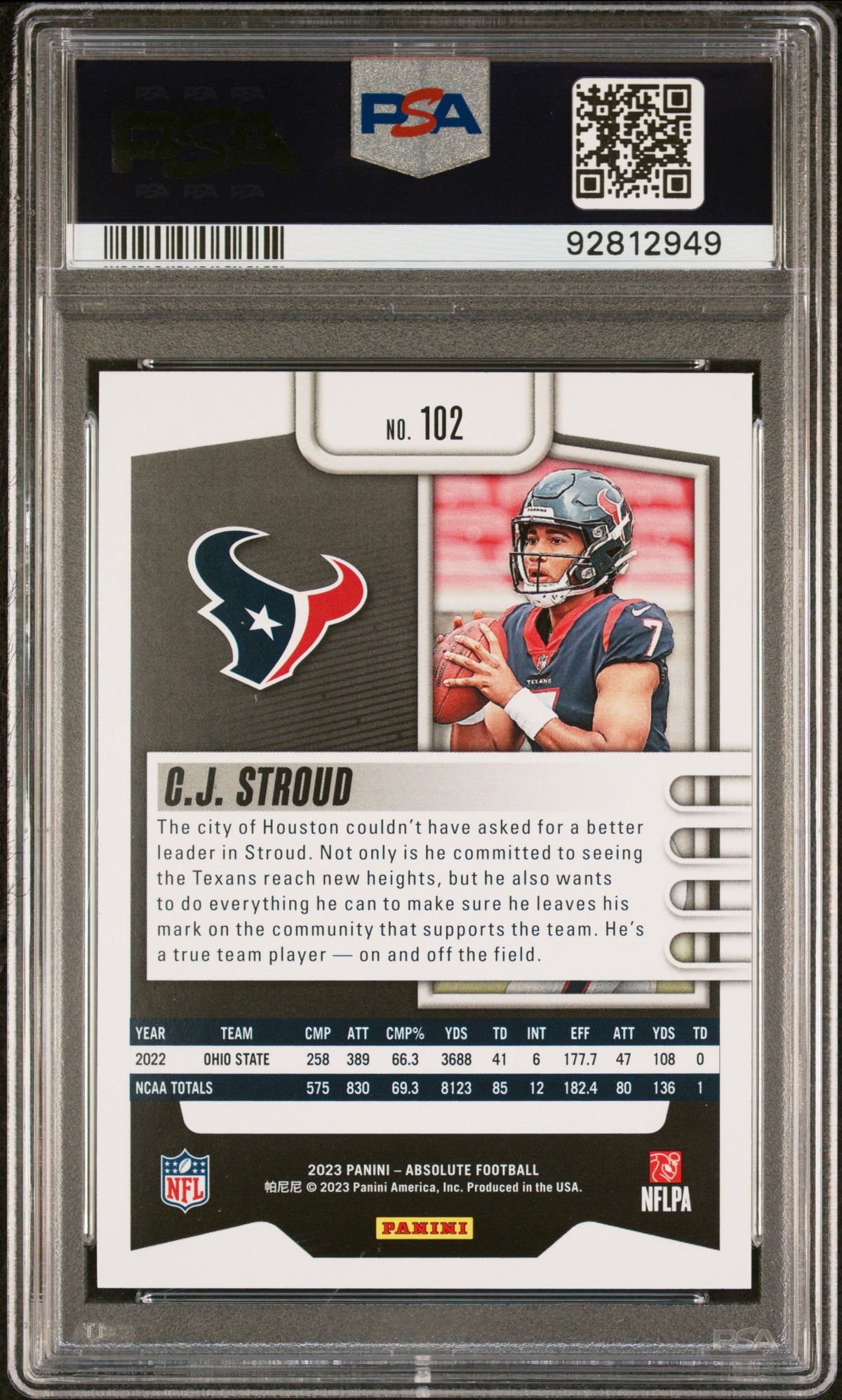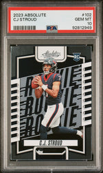 This unique piece of sports memorabilia encapsulates the excitement of football and the promise of a player at the start of his professional journey. The card's key features include the fact that it's a rookie card, it showcases C.J. Stroud, it represents the Texans in the NFL, and it's a Panini Absolute card from 2023 in a PSA 10, Gem Mint condition.