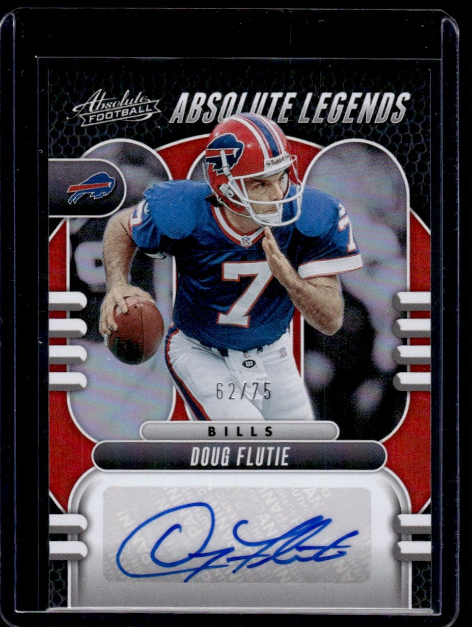 Key features of this card include its inclusion in the Absolute Legends insert set, its dedication to Doug Flutie and the Buffalo Bills, its autograph, and its limited-edition status (62/75). It's a card that any football fan, particularly Bills fans, would be proud to own.