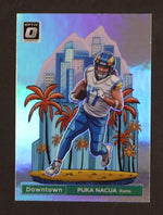 Belonging to the 2023 Donruss Optic Football set, this card is an excellent addition to any collection, whether you're a dedicated Rams fan, a Puka Nacua admirer, or a sports card enthusiast. Its key features include the Downtown insert, the player Puka Nacua, the year 2023, the Donruss Optic brand, the Rams team, and the NFL league.