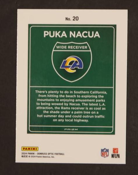 Exhibiting a sleek design, this card captures the spirit and vibrancy of the NFL. The card is not autographed, nor is it a rookie card, but its appeal lies in its straightforward simplicity and the focus on the impressive player it highlights - Puka Nacua.