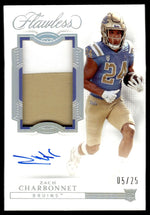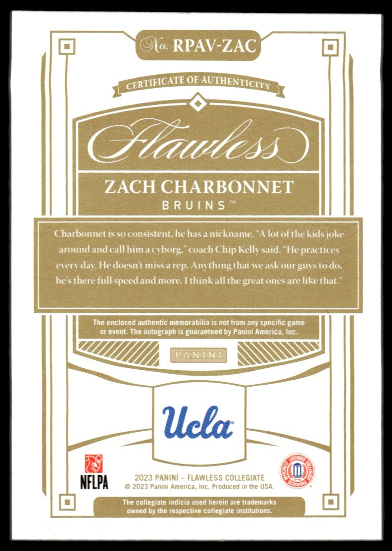 Though not professionally graded, the card belongs to the 'Flawless Collegiate' set, a testament to its high-quality production and design. This Zach Charbonnet card is a fantastic addition to any sports card collection or a unique gift for any Bruins fan.