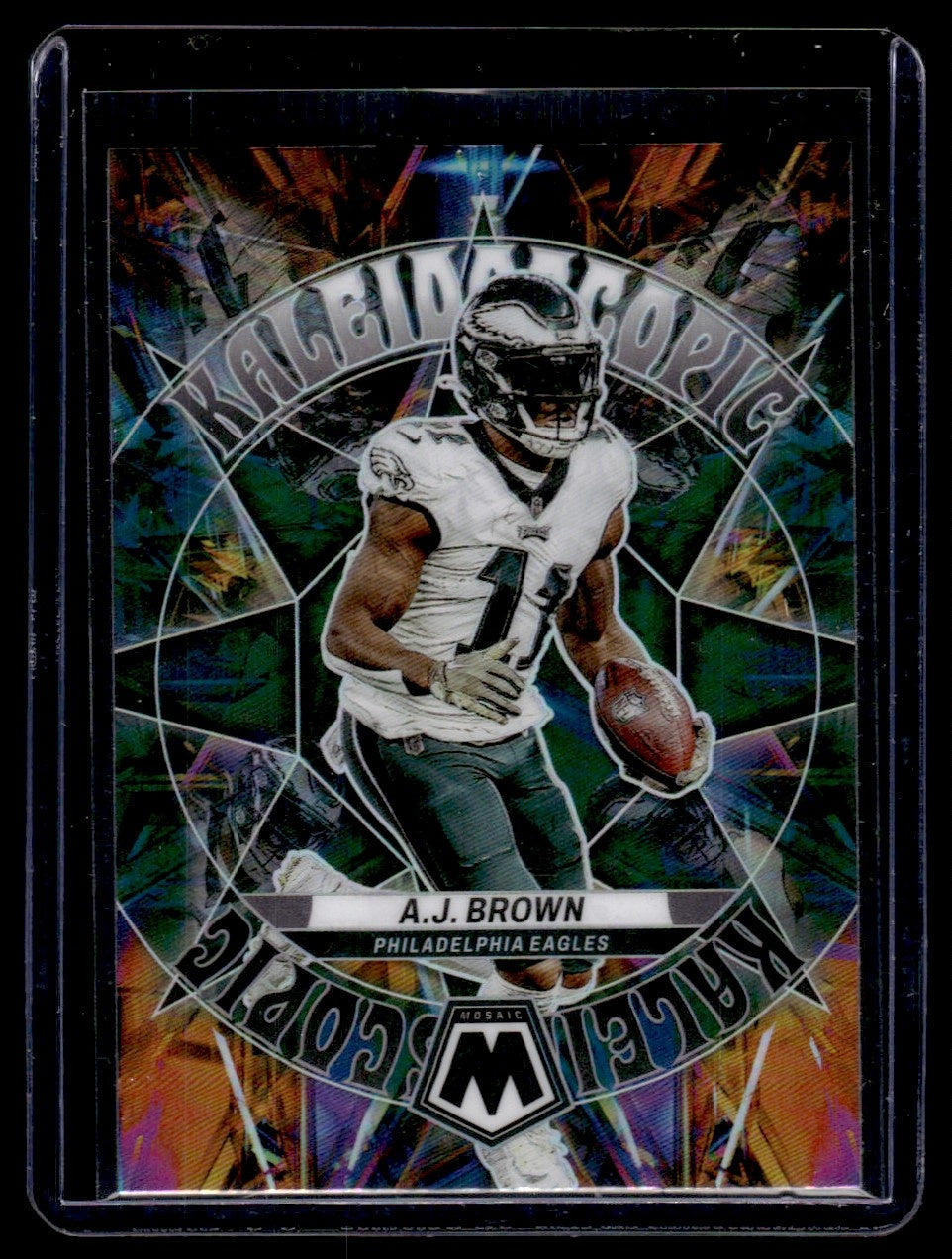 Step into the gridiron game with this striking 2023 Panini Mosaic A.J. Brown card from the exclusive Kaleidoscopic insert set. This stunning card, numbered KA-12, has been dazzling fans and collectors alike with its distinctive Prizm parallel finish, reflecting the power and dynamism of the Philadelphia Eagles' performance on the NFL field.