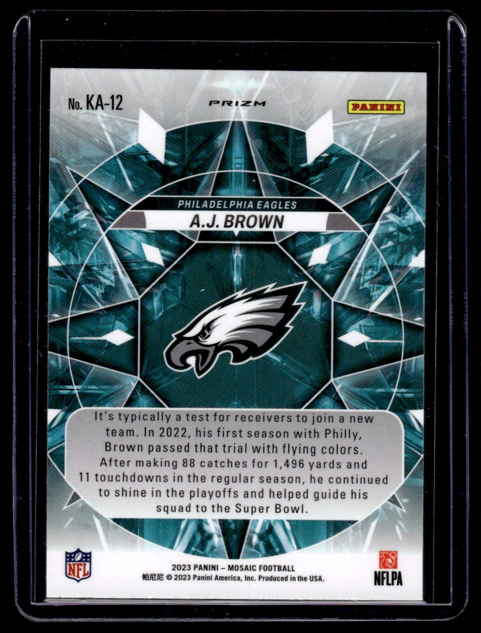 Whether you are a dedicated fan of the Philadelphia Eagles, a proud NFL follower, or a passionate sports card collector, this 2023 Mosaic KA-12 A.J. Brown card is a splendid addition to your collection. Join the ranks of those who appreciate the art of collecting, and embrace the excitement and anticipation of owning a piece of the game!