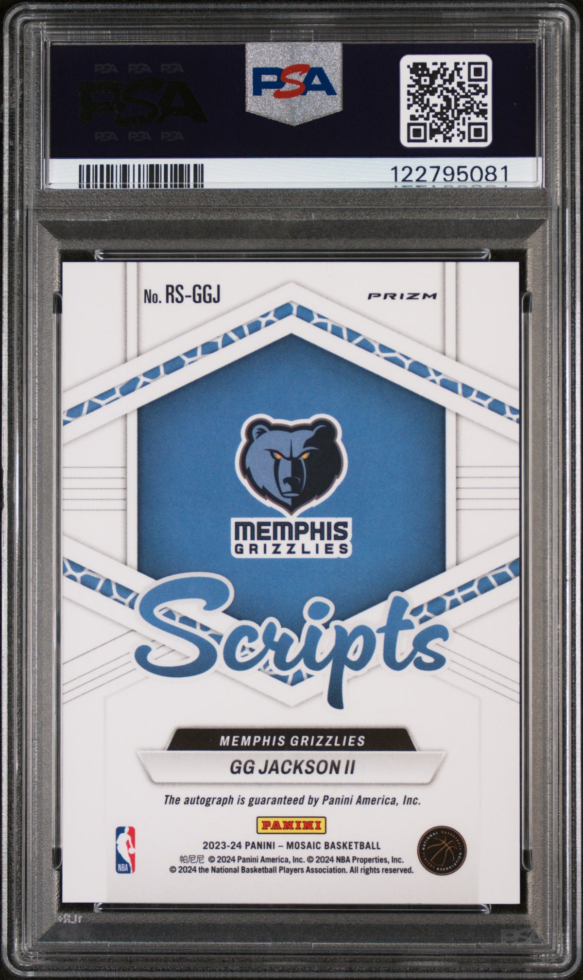 Step right up and feast your eyes on this incredible find! We have here an autographed, PSA graded, GG Jackson II Rookie card from the esteemed 2023 Panini Mosaic Basketball Set. This gem is not just any card, it's a stunning Green Ice Parallel, making it a truly exquisite addition to any sports card collection.