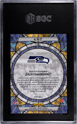 Immerse yourself in the world of NFL card collecting with this stunning 2023 Panini Mosaic Stained Glass SG-27 Zach Charbonnet rookie card. This card is a prized possession for any Seattle Seahawks fan, showcasing the highly talented Zach Charbonnet in his rookie year. The card's exceptional quality is authenticated by the prestigious SGC grading company, holding a perfect numeric grade of 10, signifying its Gem Mint condition.