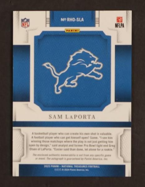 This Sam LaPorta card is part of the highly sought-after Hats Off National Treasures set by Panini, a brand synonymous with quality and reliability in the world of sports cards. It's a treasure trove for collectors, merging the world of sports and collectibles in a way that's rarely seen.