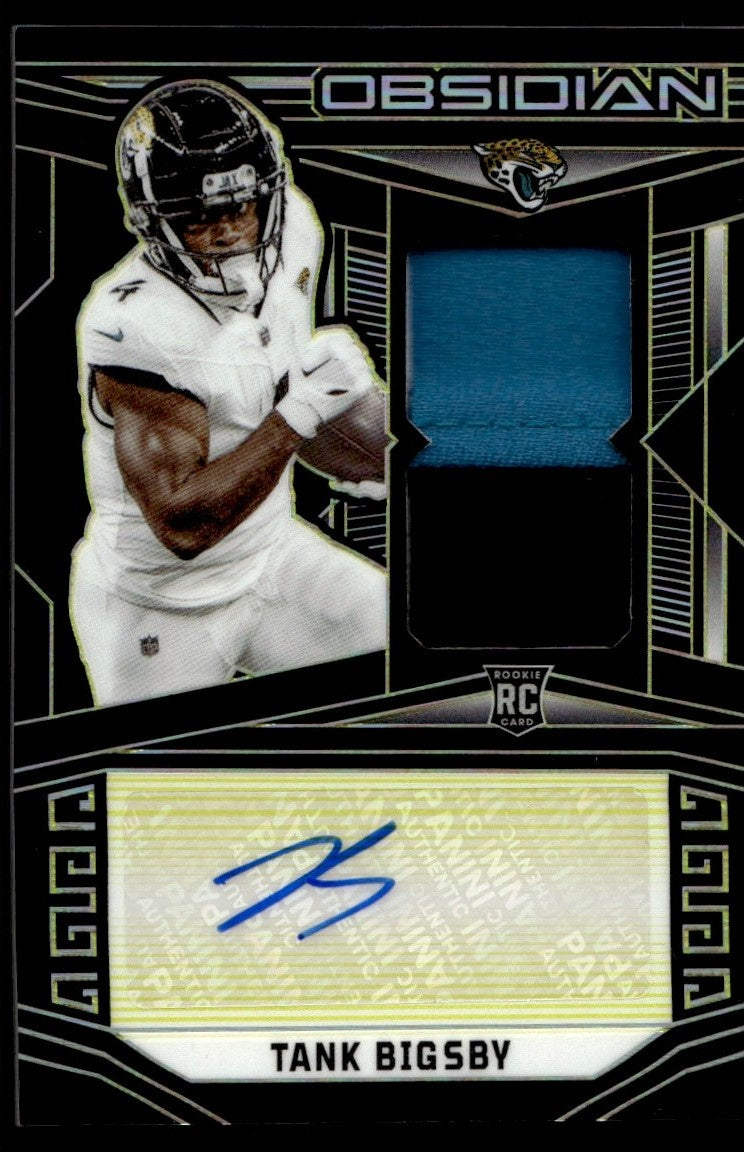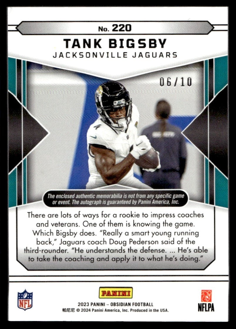 In summary, this 2023 Obsidian 220 Tank Bigsby card is more than just a collectible. It's a unique piece of sports history, a tangible connection to Tank Bigsby, and a testament to his promising career. If you're a true Jaguars fan, an avid card collector, or a sports enthusiast, this card is a must for your collection.