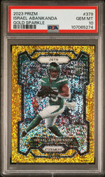 In summary, this 2023 Prizm #379 Israel Abanikanda card is a magnificent blend of sports and artistry, a truly unique piece that stands out for its gold sparkle parallel design, high PSA grading, and the promising talent it features. Whether you're a New York Jets fan, a collector of Prizm cards, or an investor in rookie cards, this card deserves a prime spot in your collection.