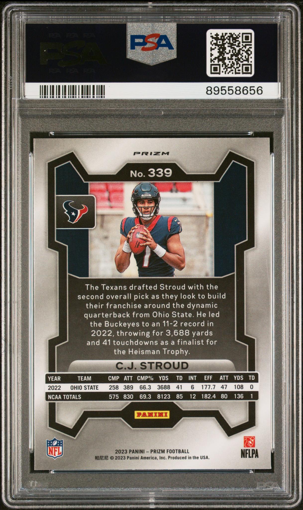 In the world of sports card collecting, this 2023 Prizm #339 CJ Stroud PSA 9 card is more than just a piece of cardboard. It's a ticket to the thrilling world of NFL, a memento of Stroud's impressive rookie year, and a shining green jewel in any collection. Don't miss your chance to own this incredible piece of sports memorabilia!