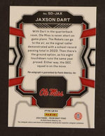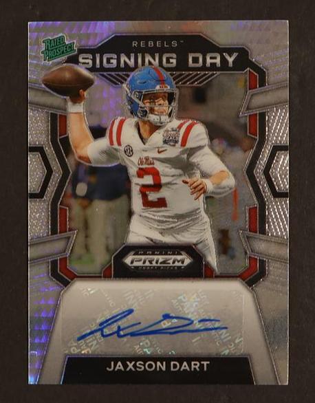 Immerse yourself in the thrilling world of football card collecting with this stunning 2023 Panini Prizm SD-JAX Jaxson Dart card. This gem, hailing from the much-sought-after 'Signing Day' insert set, is a must-have for any serious collector or avid fan of Jaxson Dart.