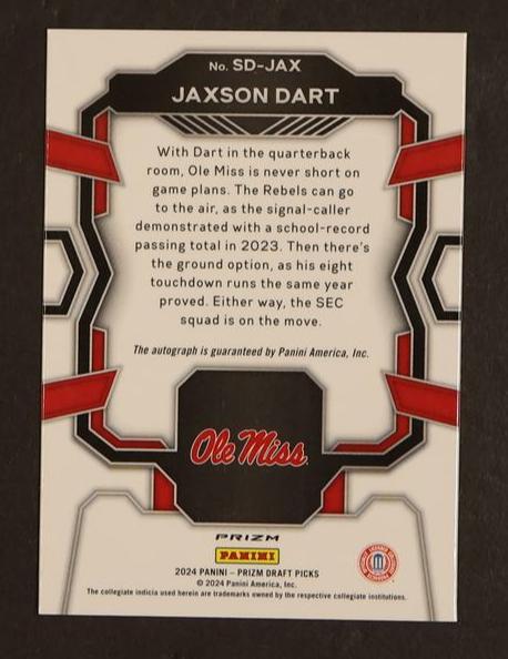 This exceptional Jaxson Dart card intertwines sports history, personal achievement, and high-end card craftsmanship, offering a stellar addition to any sports card portfolio. Whether you're a die-hard Dart fan, an Ole Miss supporter, or a sports card enthusiast, this card is a fantastic way to celebrate the spectacular talent of Jaxson Dart and the exciting world of football.