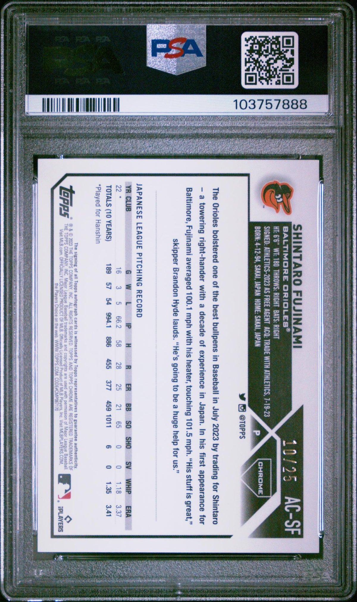 In conclusion, this 2023 Topps Chrome ACSF Shintaro Fujinami Orange Wave Refractor rookie card is a stellar addition to any collection, combining the allure of a rising baseball star, the authenticity of an autograph, and the rarity and pristine condition of the card itself. Don't miss out on the opportunity to make this exquisite piece a part of your collection.