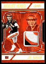 Dive into the thrilling world of football with this dynamic 2024 Panini Absolute Football card featuring the phenomenal Joe Burrow of the Cincinnati Bengals. This card holds a unique appeal as it's part of the coveted 'Absolute Heroes' insert set, known for its high-quality graphics and design.
