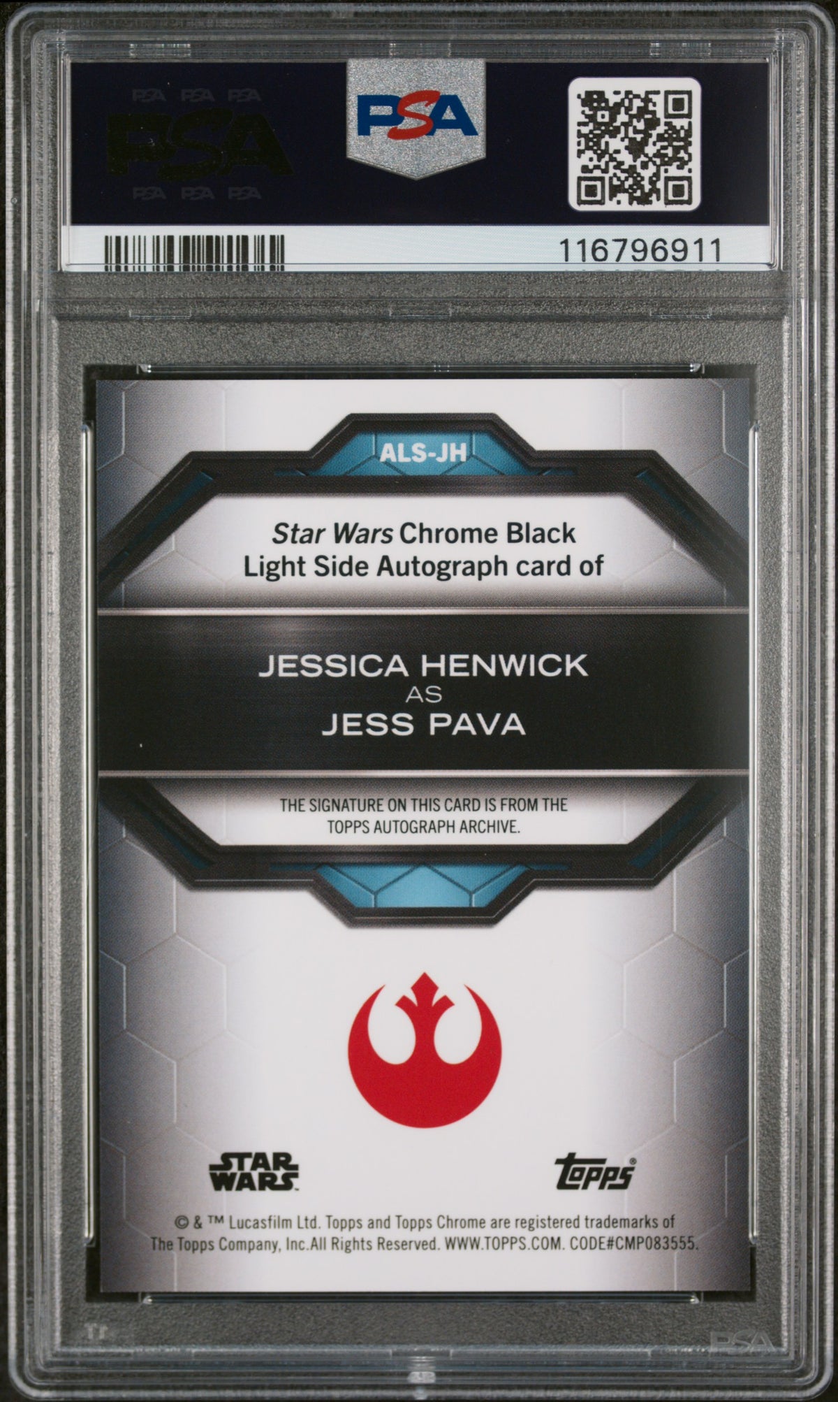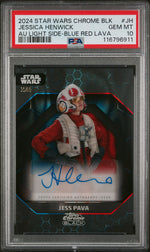 This 2024 Chrome Black #JH Jess Pava card is a part of the Star Wars Chrome Black set, a must-have for any Star Wars enthusiast. Its key features include Topps Chrome Black, Jessica Henwick, Jess Pava, Red Lava parallel, Autographed, PSA 10 Gem Mint, and Serial Numbered 38/99.