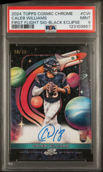 This card's key features include its 2024 release, Topps Cosmic Chrome brand, First Flight Signatures insert, Black Eclipse parallel, autograph, and serial number 10/10. In addition, its PSA grade of Mint 9 seals its status as a high-quality, highly collectible item.