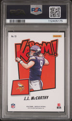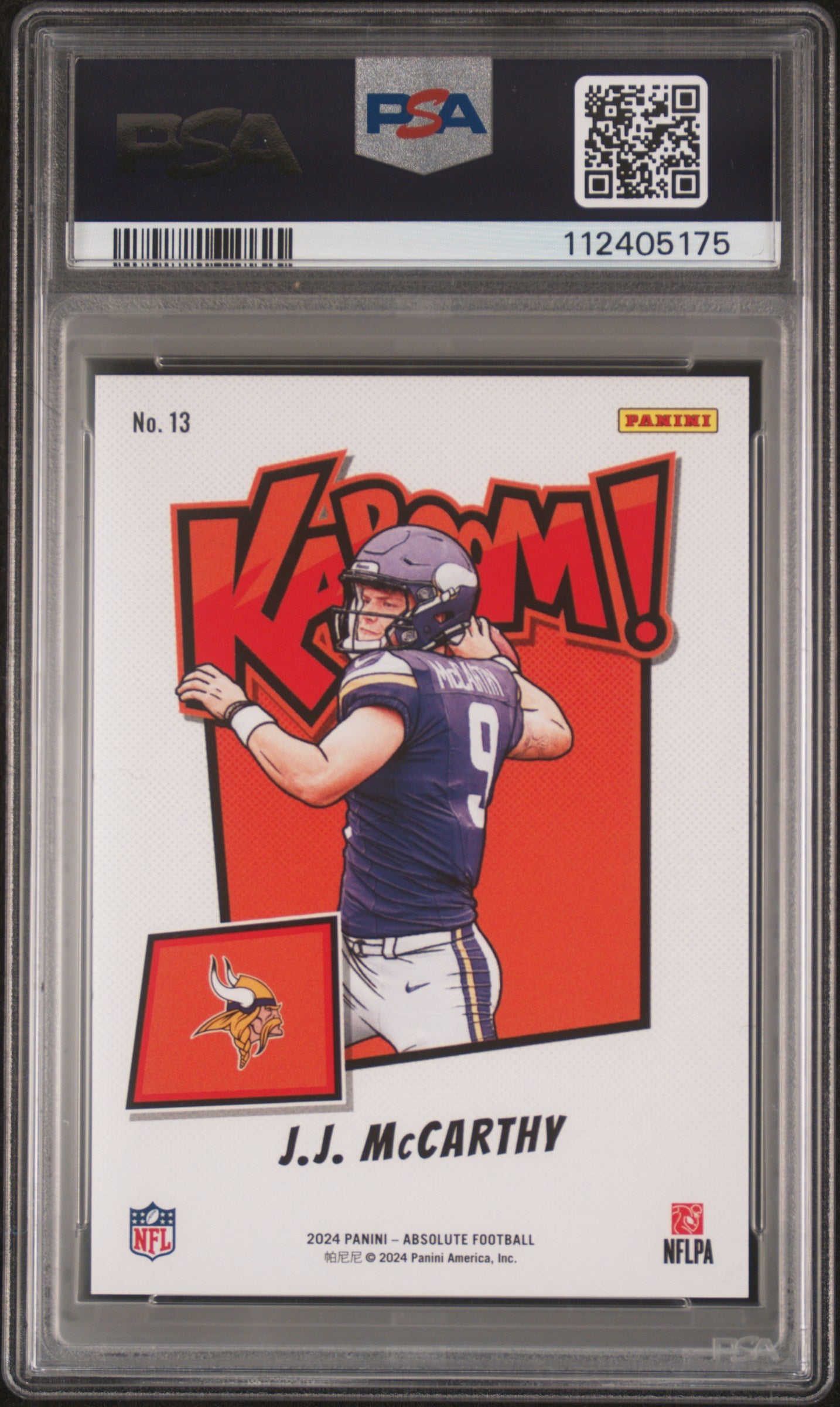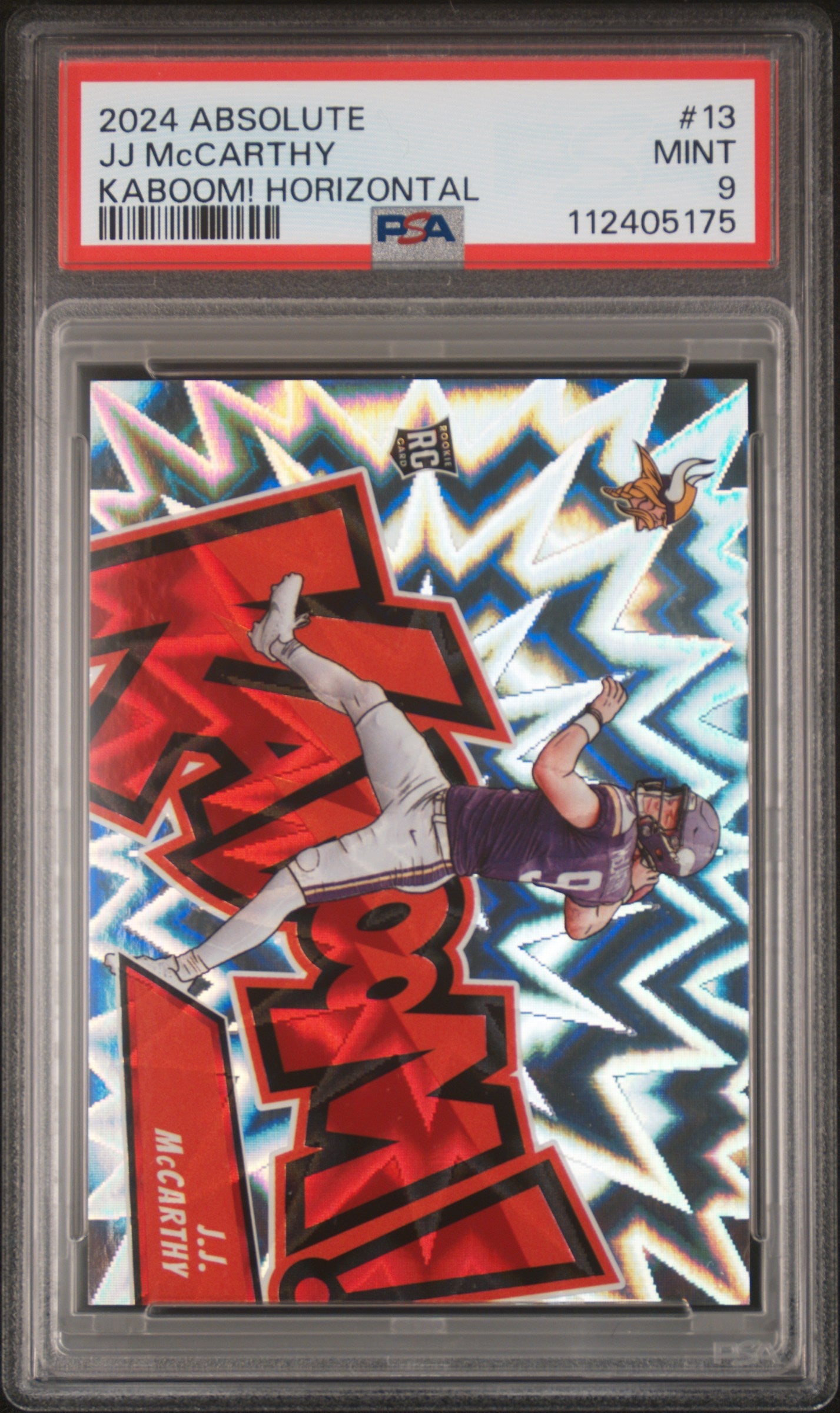 In terms of features, the card boasts the key elements of the 2024 Absolute series, the Kaboom! Horizontal design, J.J. McCarthy's dynamic presence, his status as a rookie, and the PSA Mint 9 grading. All these contribute to making this card an absolute must-have for any football card collector, Minnesota Vikings fan, or NFL enthusiast.