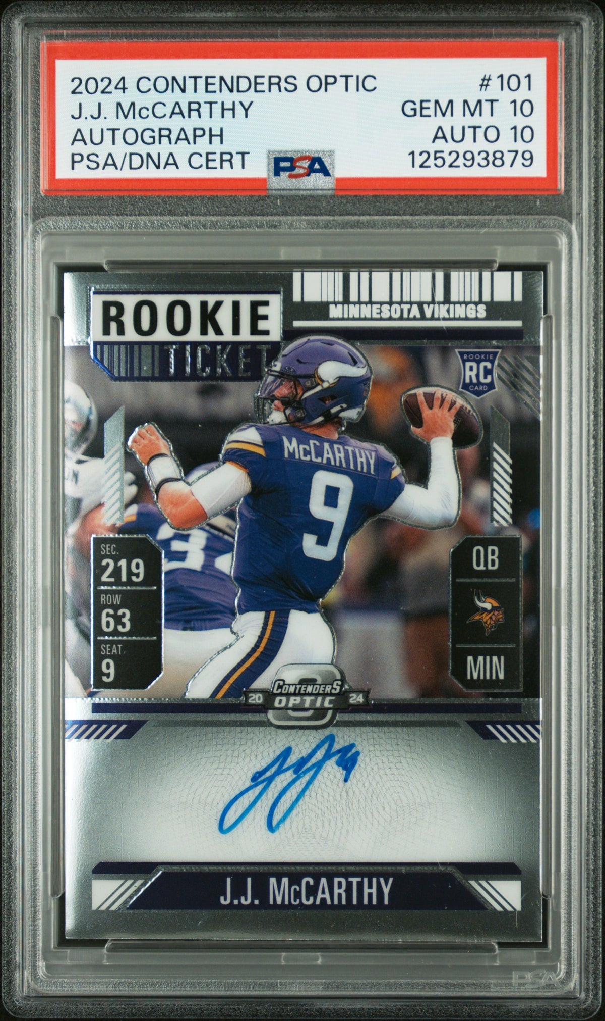 2024 Panini Contenders Optic Rookie Tkt JJ McCarthy #101 RC Auto PSA 10 Auto 10