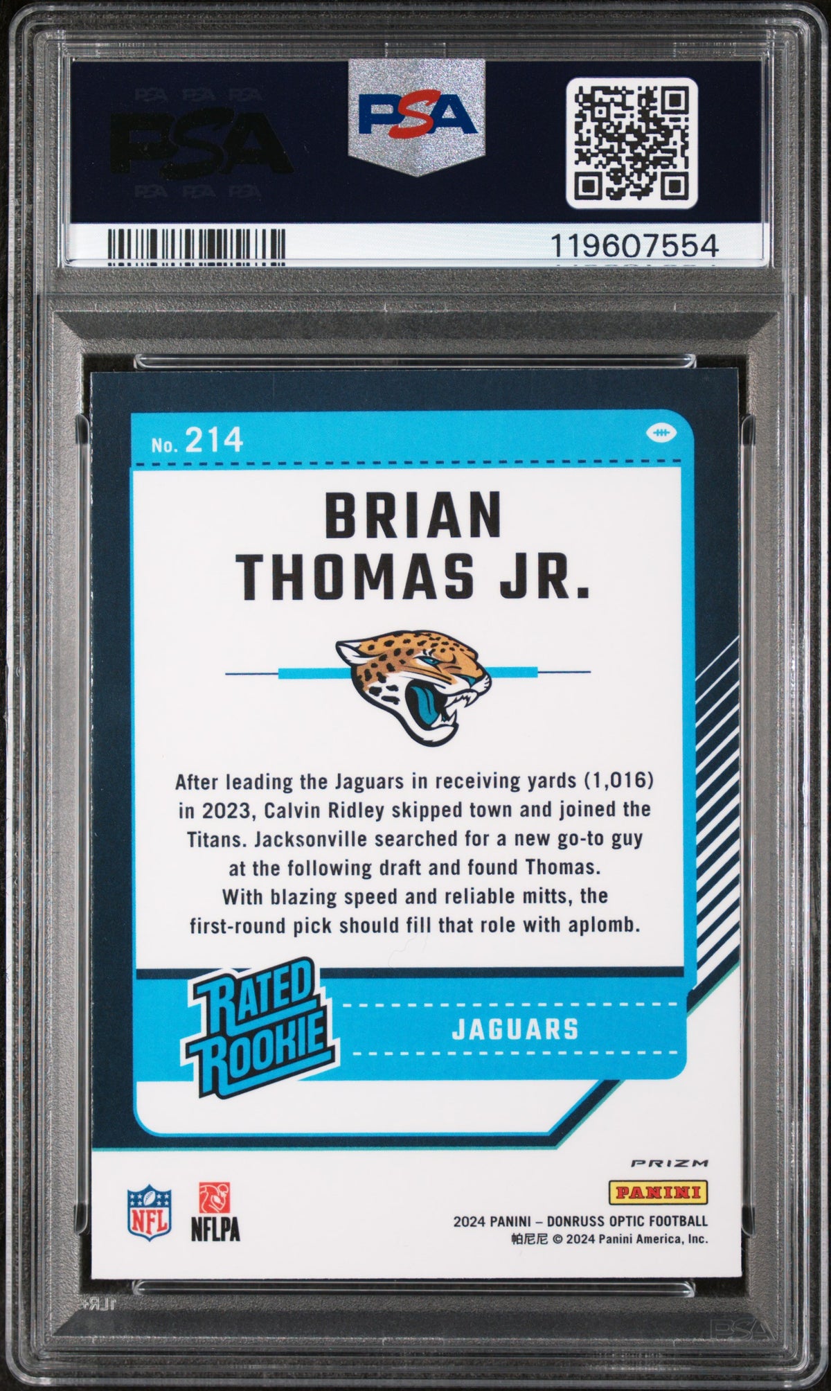 The card is professionally graded by PSA, the leading authority in card grading, ensuring its authenticity and impeccable 'Mint' condition. It's a tangible piece of NFL history, a testament to the talent and potential of Brian Thomas Jr. during his rookie year with the Jaguars.