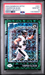 What sets this card apart is the stunning Green Velocity parallel, adding an eye-catching touch that elevates the overall aesthetics. A rarity indeed! But the real cherry on top here is the card's condition. Professionally graded by the prestigious PSA, this gem proudly boasts a perfect score of 10, classifying it as 'Gem Mint'. A testament to its impeccable condition, this card is a shining example of preservation and quality.