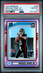 This card does not include an autograph or memorabilia but shines brightly with its key features. The 'Rated Rookie' label signifies Michael Penix Jr.'s promising start in the NFL, while the 'Optic Preview-Pink' attribute adds an impressive touch to its visual appeal.