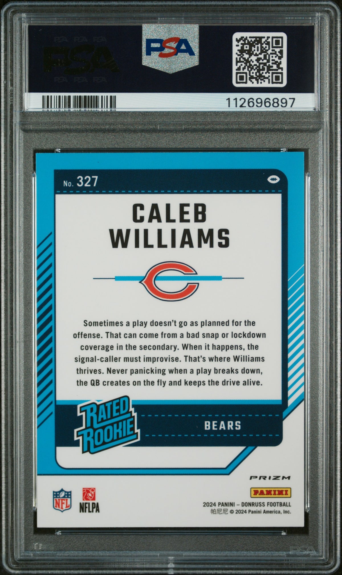In conclusion, this Caleb Williams sports card is more than just a collectible item; it is a piece of NFL history that celebrates the early career of an exciting player. Its high grade, unique features, and association with esteemed brands make it a standout addition to any sports card collection. Be it for investment or for the love of the game, this card is an exceptional choice to consider.