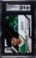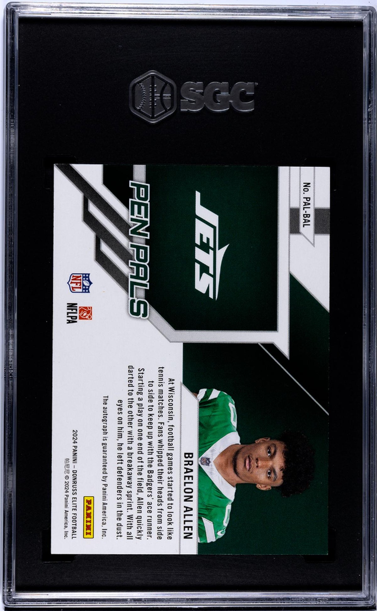 Key features of this stunning card include its autograph, the rookie status, the 9.5 SGC grading, its association with the New York Jets, the Pen Pals and Elite design, the player Braelon Allen, and its NFL affiliation.