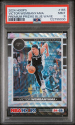 This card hails from the esteemed 2024 edition of Panini's NBA Hoops collection, a brand well-respected for its quality and attention to detail. The card is part of the coveted 'Premium Prizms Blue Wave' insert set, adding a vibrant hue to your collection. The 'Blue Wave' parallel design enhances its aesthetic appeal, making it a standout piece.