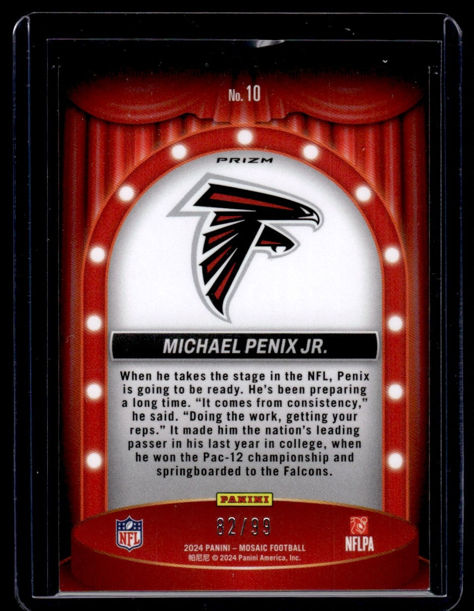 In summary, this 2024 Prizm 10 Michael Penix Jr. Card encapsulates the spirit of the sport and the thrill of collecting. Its limited edition status, mosaic design, and rookie card feature make it a valuable find for any sports card enthusiast or Atlanta Falcons supporter. Don't miss out on the opportunity to own a piece of the NFL's rising star, Michael Penix Jr.'s journey!