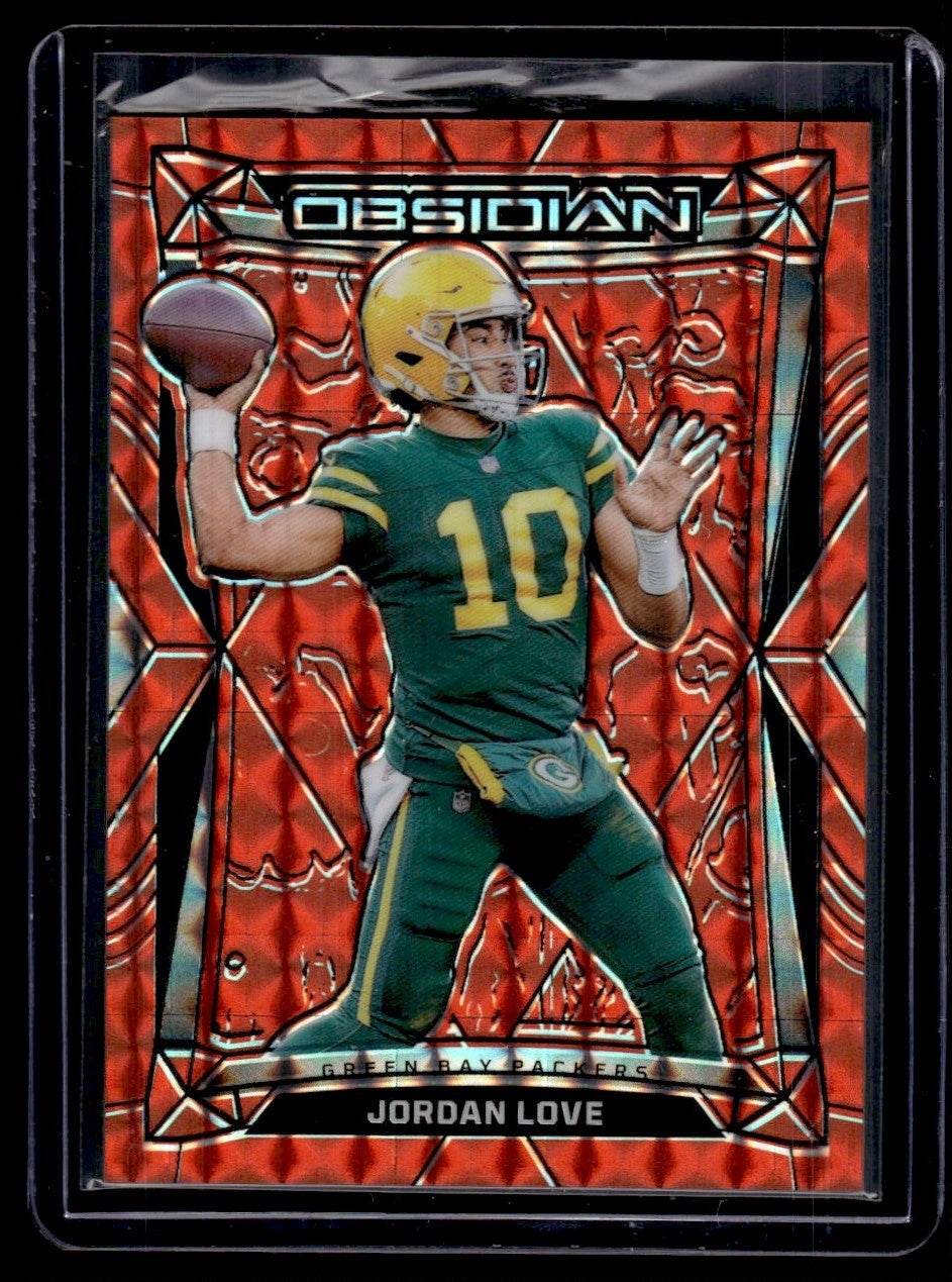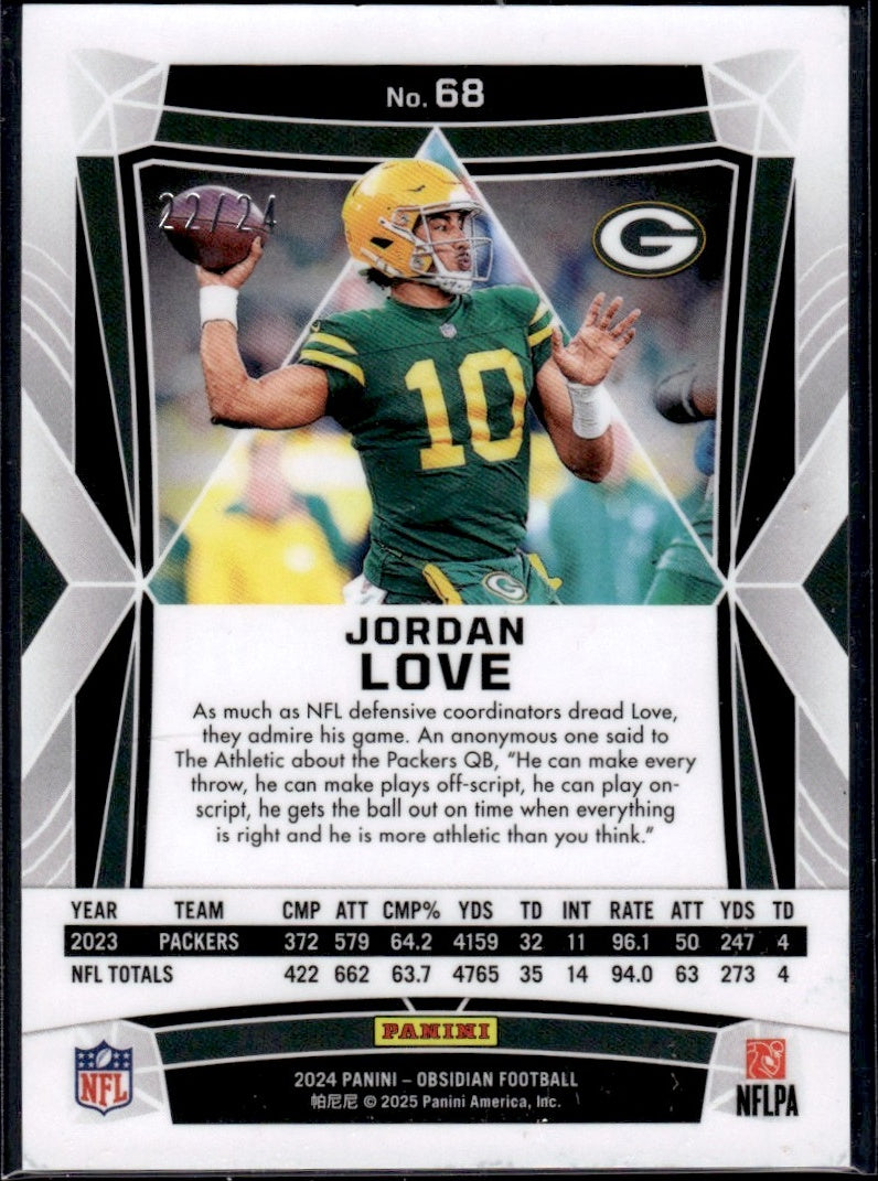 Feast your eyes on this magnificent 2024 Panini Obsidian Football card, featuring the highly talented Jordan Love of the Green Bay Packers. As a standout in the NFL, Love's card is a must-have addition to any serious football card collection. This card is not just a card - it's a piece of sports history, bearing the well-respected Panini Obsidian brand name and the serial number 244, adding a layer of exclusivity to it.