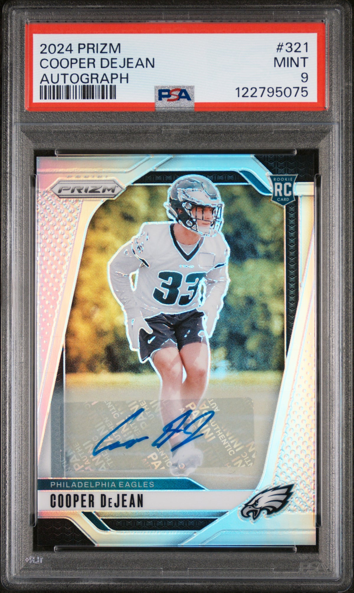 Step right up, sports enthusiasts and card collectors! Feast your eyes on this gem - a 2024 Prizm #321 Cooper DeJean Autograph. This is no ordinary card; it's a treasure trove of uniqueness and rarity. Crafted by renowned manufacturer Panini under the Prizm brand, this card features the immensely talented Cooper DeJean of the Philadelphia Eagles. As a football aficionado, you're well aware of the prowess and potential this player brings to the NFL. Now, you have the chance to own a piece of that excitement. But wait, there's more. This isn't just a regular card. It's a Rookie Card, marking DeJean's first steps in his professional journey. A rookie card is a cornerstone of any sports card collection, and this one is no exception. What makes it even more special is the autograph. Yes, this card is personally autographed by DeJean himself, adding an extra layer of authenticity and uniqueness. The card's condition? Mint. And when we say mint, we mean it. This card has been professionally graded by PSA, a trusted name in the industry, and has received a high grade of 9. This means the card is virtually flawless, with only the smallest of imperfections. This 2024 Prizm #321 Cooper DeJean Autograph is a must-have for any serious collector or fan. It brings together a top-notch player, a respected manufacturer, a high-quality brand, and an autograph, all captured in a stunning rookie card. Don't let this opportunity pass you by. Add this card to your collection today and enjoy the thrill of owning a piece of sports history.