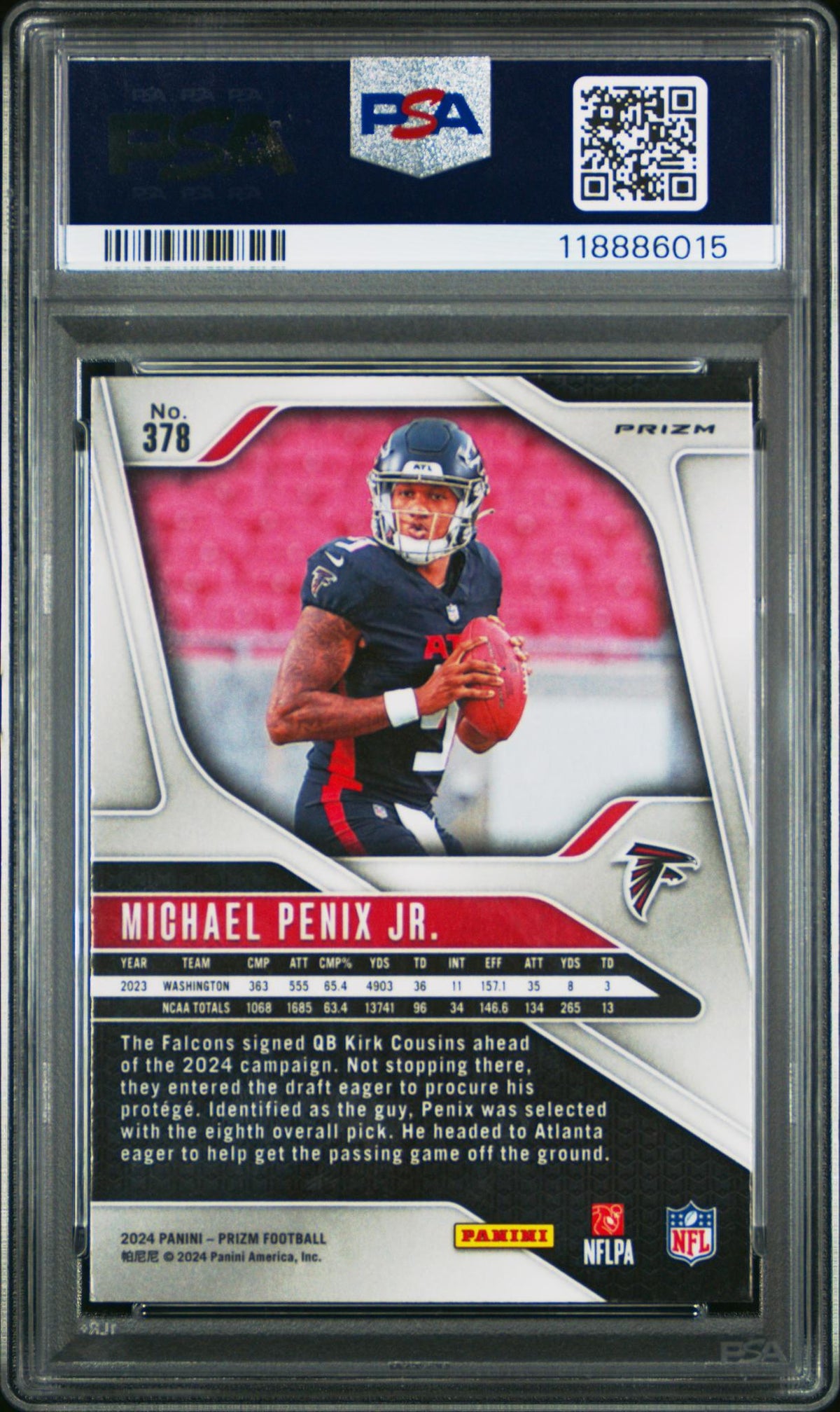 Introducing an exceptional find for all football enthusiasts - the 2024 Prizm #378 Michael Penix Jr. rookie card. Manufactured by the esteemed Panini brand, this radiant card belongs to the coveted Prizm Football Set and features the spectacular Lazer Prizm parallel. This card is not just a piece of cardboard, but a tangible representation of Michael Penix Jr.'s inaugural season with the dynamic Atlanta Falcons of the NFL. You'll be thoroughly impressed with the card's pristine condition, professionally graded as Mint 9 by the renowned PSA. This indicates a card that has been handled with utmost care, reflecting a level of quality that is often sought but rarely found. Despite its young age, this card has an undeniable air of rarity and premium quality. It's not autographed, nor does it include any memorabilia, but this card has its own unique charm that sets it apart. Its exceptional detailing, vivid colors, and the unique 'Lazer Prizm' finish all contribute to its appeal. This is more than just a sports card; it's a piece of NFL history, capturing the early career of a promising player. Whether you're a die-hard Falcons fan, a dedicated collector of Prizm cards, or a Michael Penix Jr. enthusiast, this card is a must-have addition to your collection. It's not just about owning a card; it's about owning a piece of sports history. Get your hands on this 2024 Prizm #378 Michael Penix Jr. card today and treasure this priceless memento for years to come!