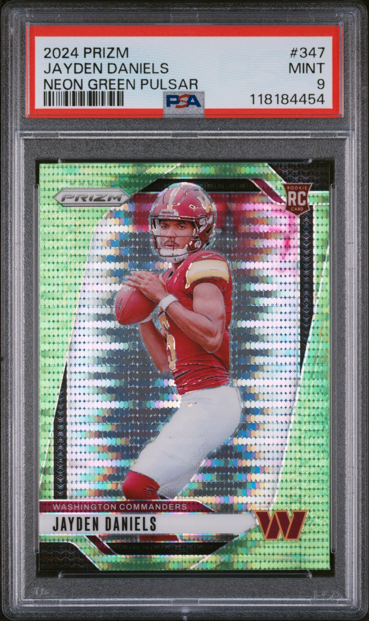 Key features to note include its status as a rookie card, its striking Neon Green Pulsar parallel, and its exceptional PSA Grade 9 mint condition. A vibrant tribute to Jayden Daniels' time with the Washington Commanders, this card is a must-have for serious NFL collectors. Don't miss out on the chance to own a piece of football history and add this exquisite card to your collection today.