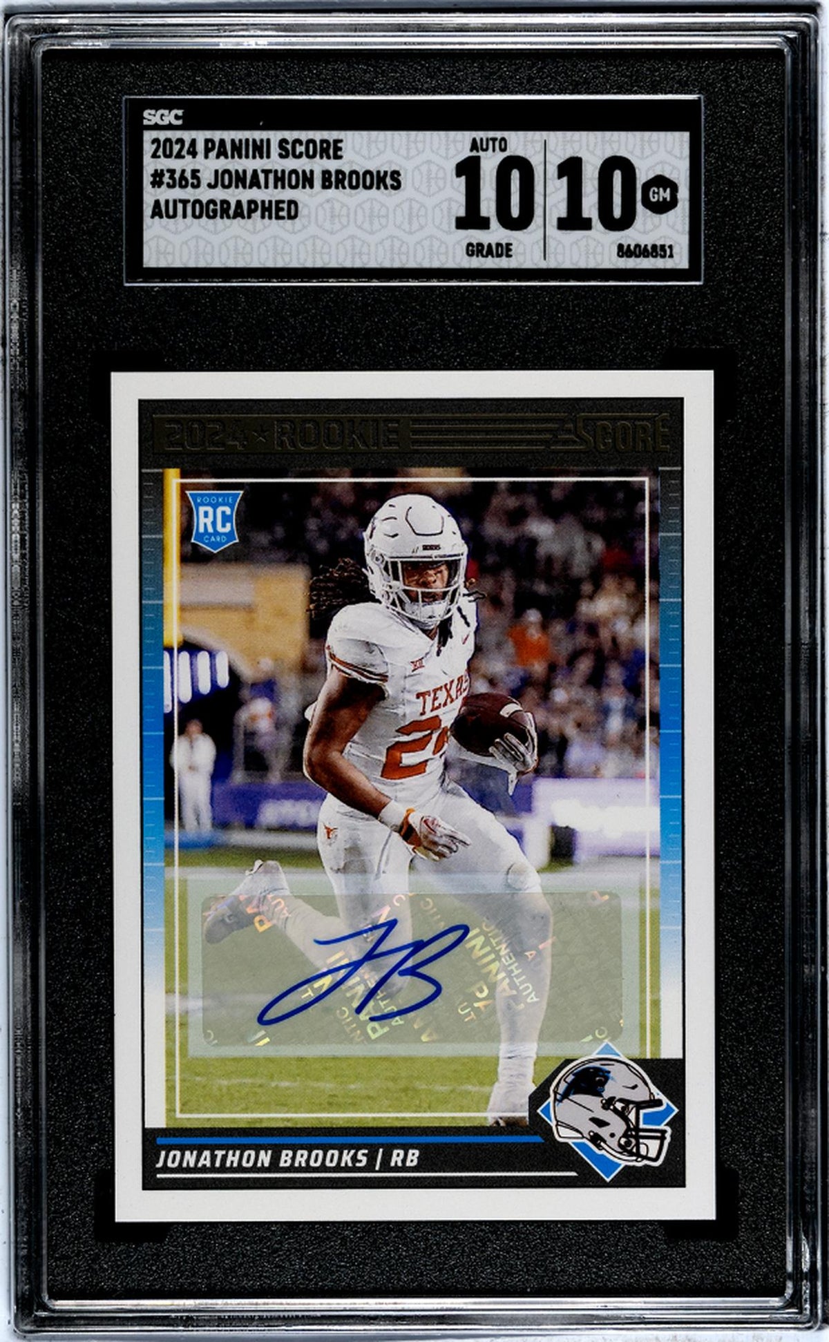 The key features of this card - being autographed, a rookie card, a perfect grade of Gem Mint 10, and part of the illustrious 2024 Panini Score series - make it a highly desirable piece. If you're a fan of the NFL, Carolina Panthers, or Jonathon Brooks himself, this card is a must-have addition to your collection.