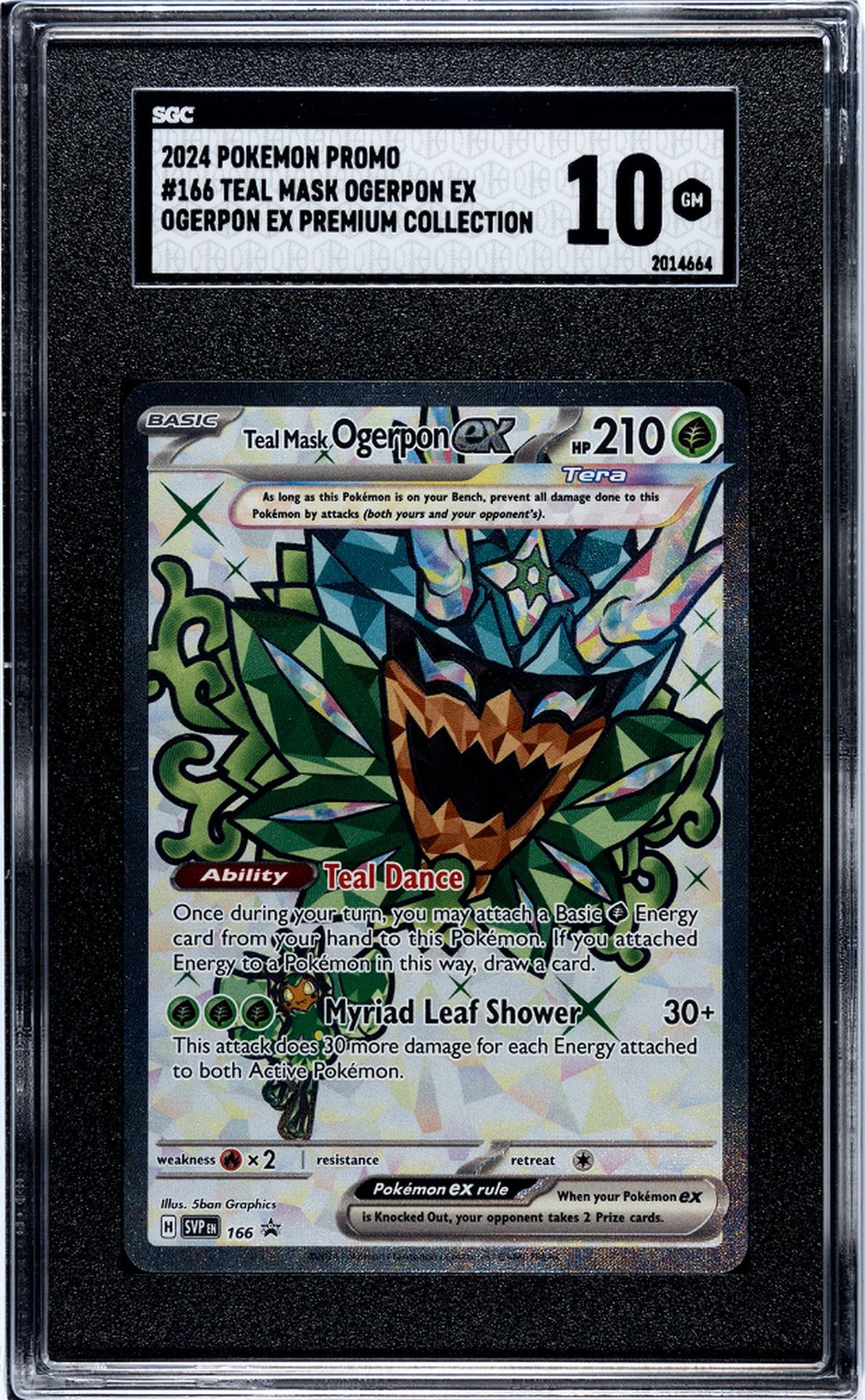 Immerse yourself in the captivating world of Pokemon with this exceptional sports card featuring the illustrious 'Teal Mask Ogerpon'. Manufactured by the esteemed 'Pokemon' brand in 2024, this card is a standout piece from the 'Ogerpon EX Premium Collection'. A testament to its impeccable condition, this card has been professionally graded as a '10' by the renowned 'SGC' grading company, affirming its 'Gem Mint' condition.