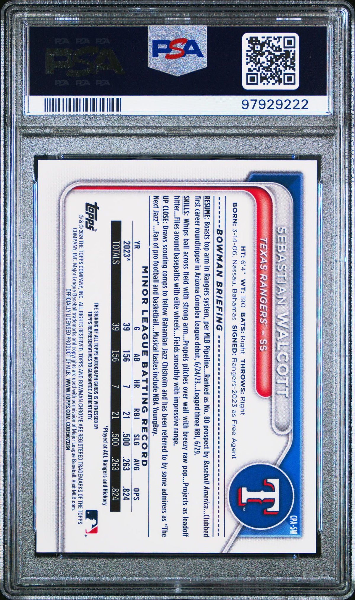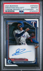 The key features of this card include Walcott's autograph, its Gem Mint 10 grade by PSA, its affiliation with the Texas Rangers and MLB, its belonging to the Chrome Prospect Autograph Series, and its 2024 Bowman make. This exceptional card is a tribute to the timeless allure of baseball and the thrilling talent that graces its field.