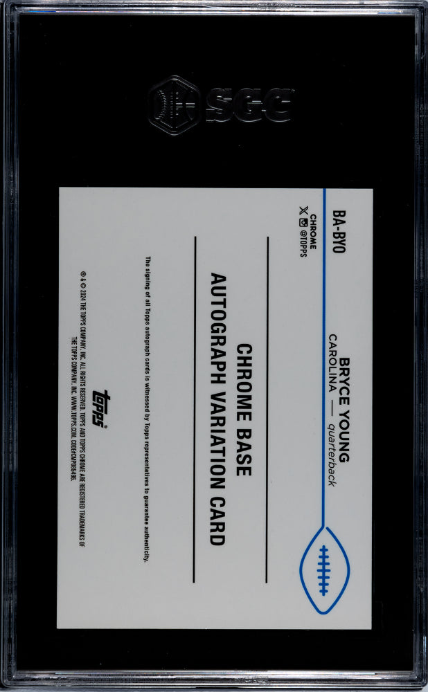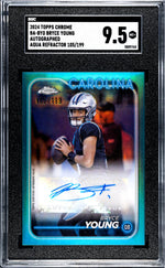 This 2024 Topps Chrome Bryce Young card, part of the 'Chrome Base Autograph Variation' set, is not just a card. It's a slice of sports history, a tangible symbol of Bryce Young's remarkable journey. Key features include the Aqua Refractor, the authentic autograph, and the unique serial number, all culminating in a mint+ 9.5 graded card that's truly one-of-a-kind.