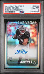 Step into the big league by adding this exceptional 2024 Topps Chrome #RABBO Brock Bowers Autograph card to your collection. Manufactured by Topps, the leading name in sports cards, this spectacular card is from the coveted 'Chrome Base Autograph Variation' insert set, amplifying its appeal to both passionate collectors and hardcore football fans alike. As a rookie card, it celebrates the early career of Brock Bowers, a promising talent who has made his mark with the Las Vegas team. This card's allure is further magnified as it has been professionally graded by PSA, the trusted authority in card grading, with a remarkable numeric grade of 8 and a condition description of NM-MT (Near Mint to Mint), assuring you of its superior quality and preservation. This Topps Chrome 2024 card is a must-have for any serious football card collector, as it captures the essence of the sport while also highlighting a significant milestone in Brock Bowers' career. Its autograph edition feature adds a personal touch from Bowers himself, making it a truly unique collectible. Don't miss out on the opportunity to enhance your collection with this Brock Bowers rookie card. Its aesthetic appeal and intrinsic value only promise to grow over time, making it an excellent addition to your sports memorabilia. Secure this gem today and be the envy of your card collecting peers.