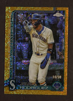 It's important to note that this card does not include memorabilia, which allows the focus to remain solely on the player and the sport he represents. The key features of this card include its gold parallel design, the serial number 10/50, the Topps Chrome brand, the Seattle Mariners team, the MLB league, and of course, Julio Rodriguez himself.