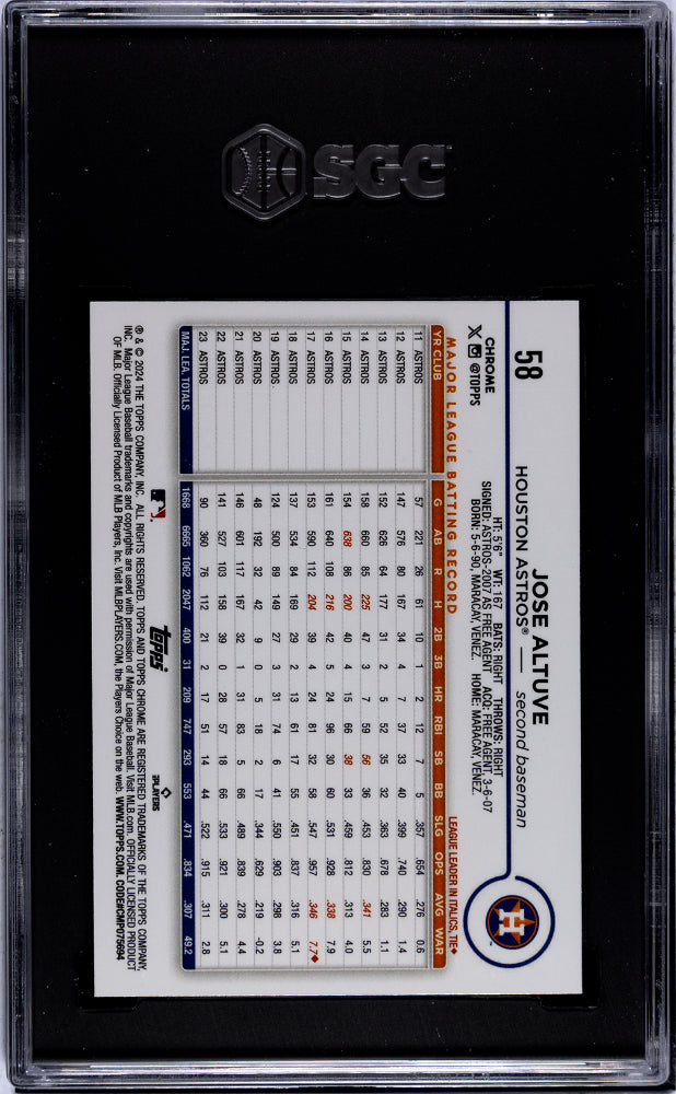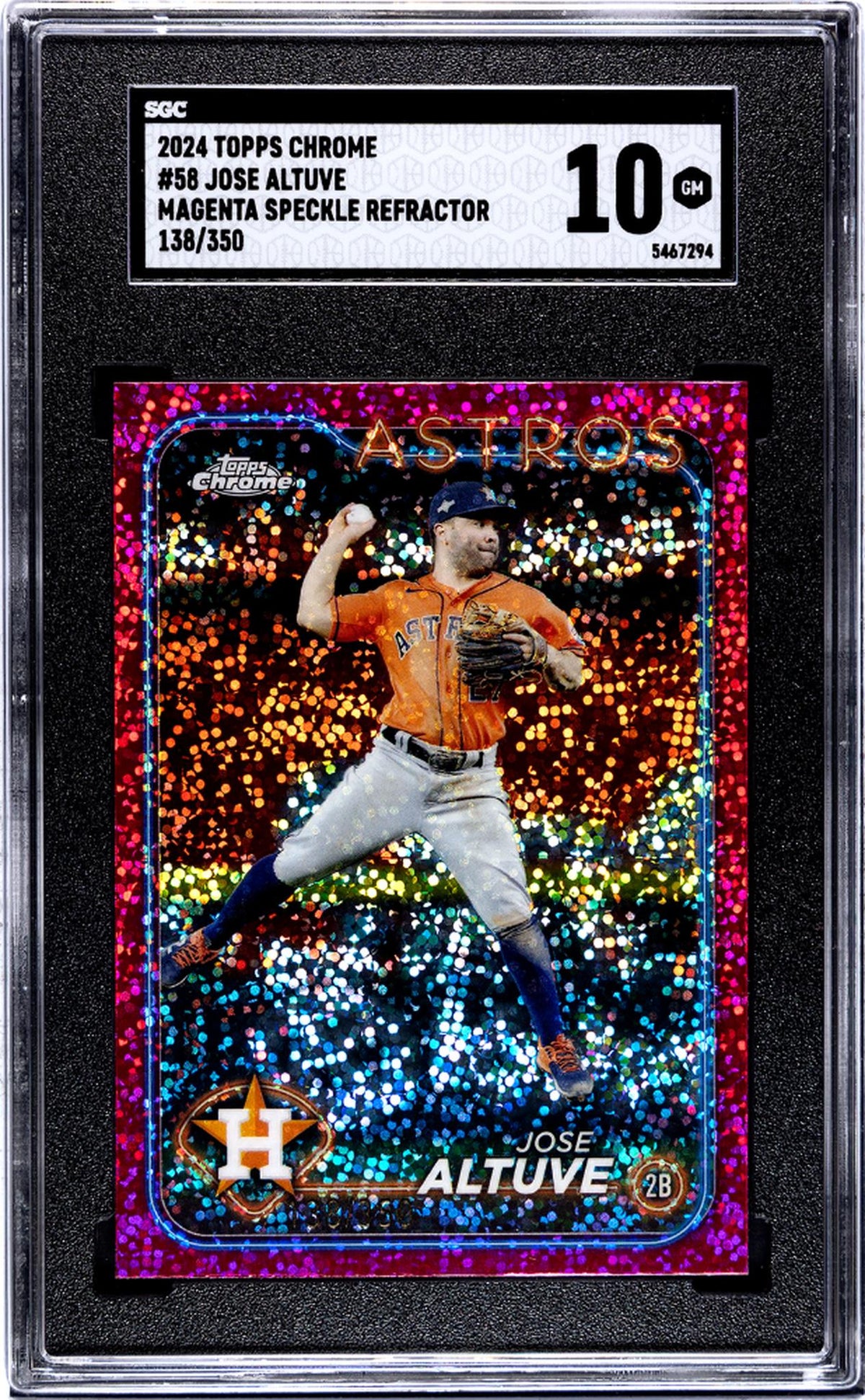 Behold the exceptional Jose Altuve baseball card, brought to you by the renowned manufacturer Topps under their elite brand - Topps Chrome. This masterpiece, produced in 2024, holds the esteemed position of being card number '58' in the Magenta Speckle Refractor insert set.