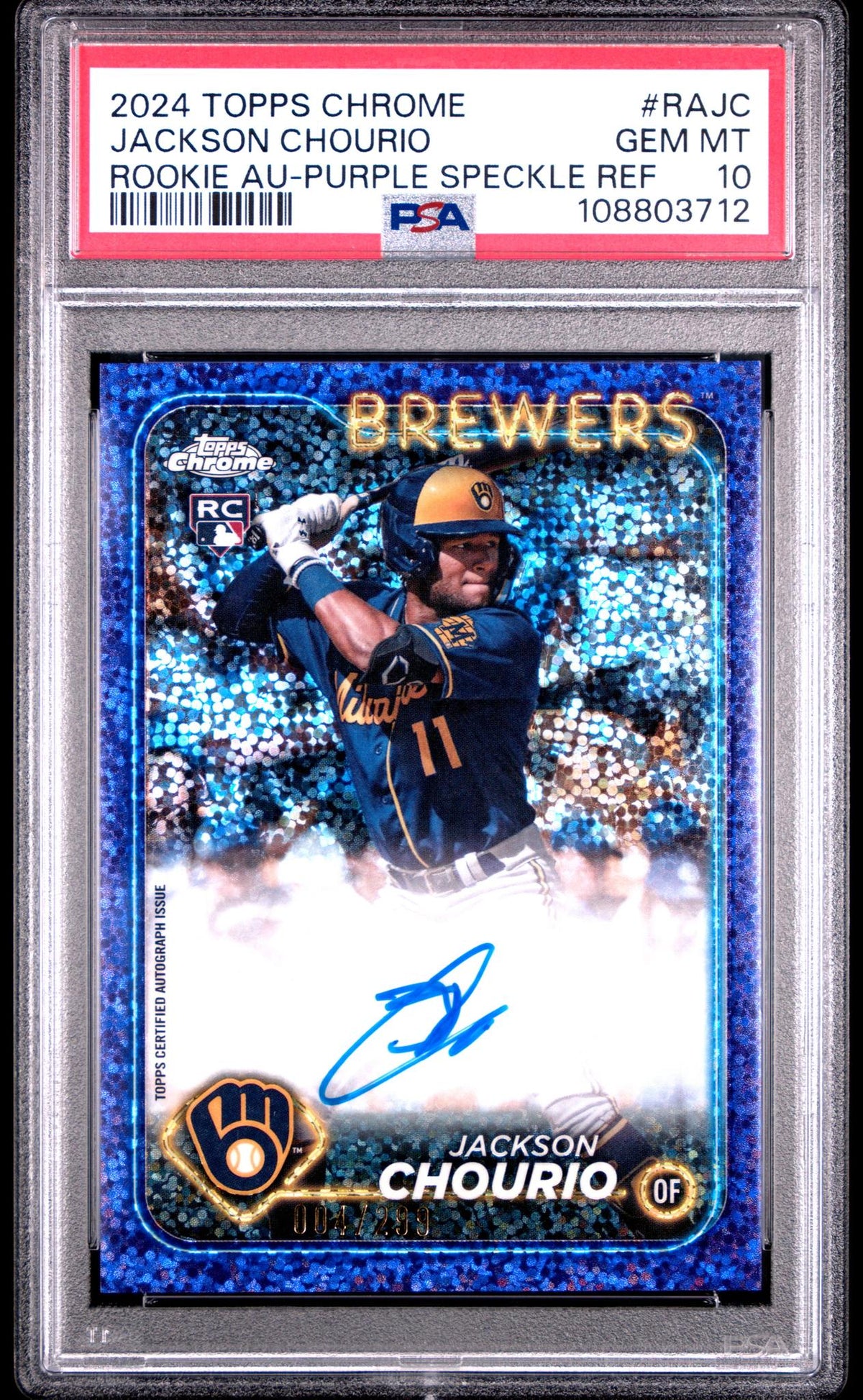 Key features of this card include its rookie status, autograph, Purple Speckle Refractor design, and exclusive serial number, all packaged in a PSA Gem Mint 10 condition. This is more than just a baseball card--it's a piece of treasure for any serious collector. Secure this card now and own a piece of the legacy of the phenomenal Jackson Chourio.